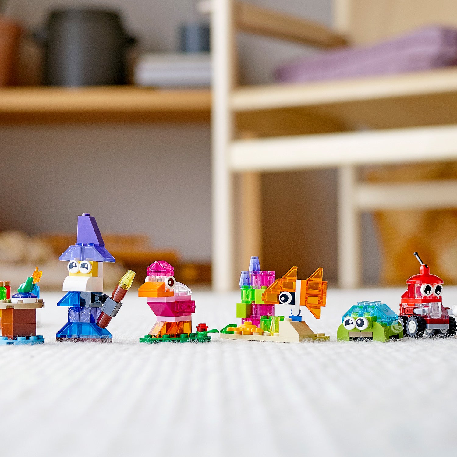 - Kick-start kids’ creativity with this inspiring 500-piece playset, featuring a dazzling array of transparent LEGO® pieces, plus classic LEGO bricks, eyes and wheels for creating 8 fun models and more.
