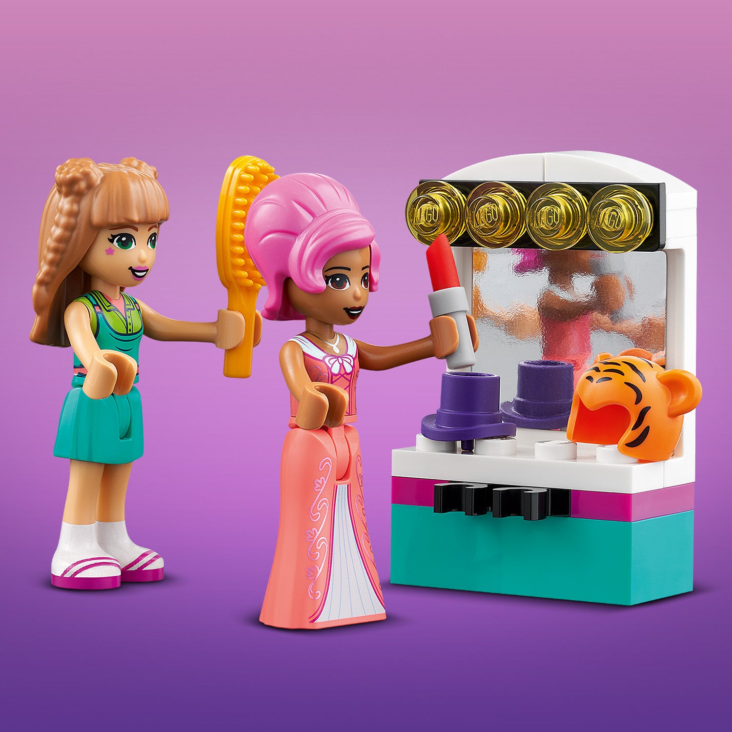 The Victorian facade opens to create the theater, complete with orchestra and balcony seats. Opening the textile theater curtains reveals 2 backdrops – a medieval castle and a nighttimecityscape. Spin the theater round and there’s rigging for the lights and a dressing room where characters get made up, just like at a real theater! There are also toy props so kids can create dramatic scenes of their own. LEGO® Friends Andrea, Ollie and Freya can act out parts under the tutelage of Prof. Adrian.