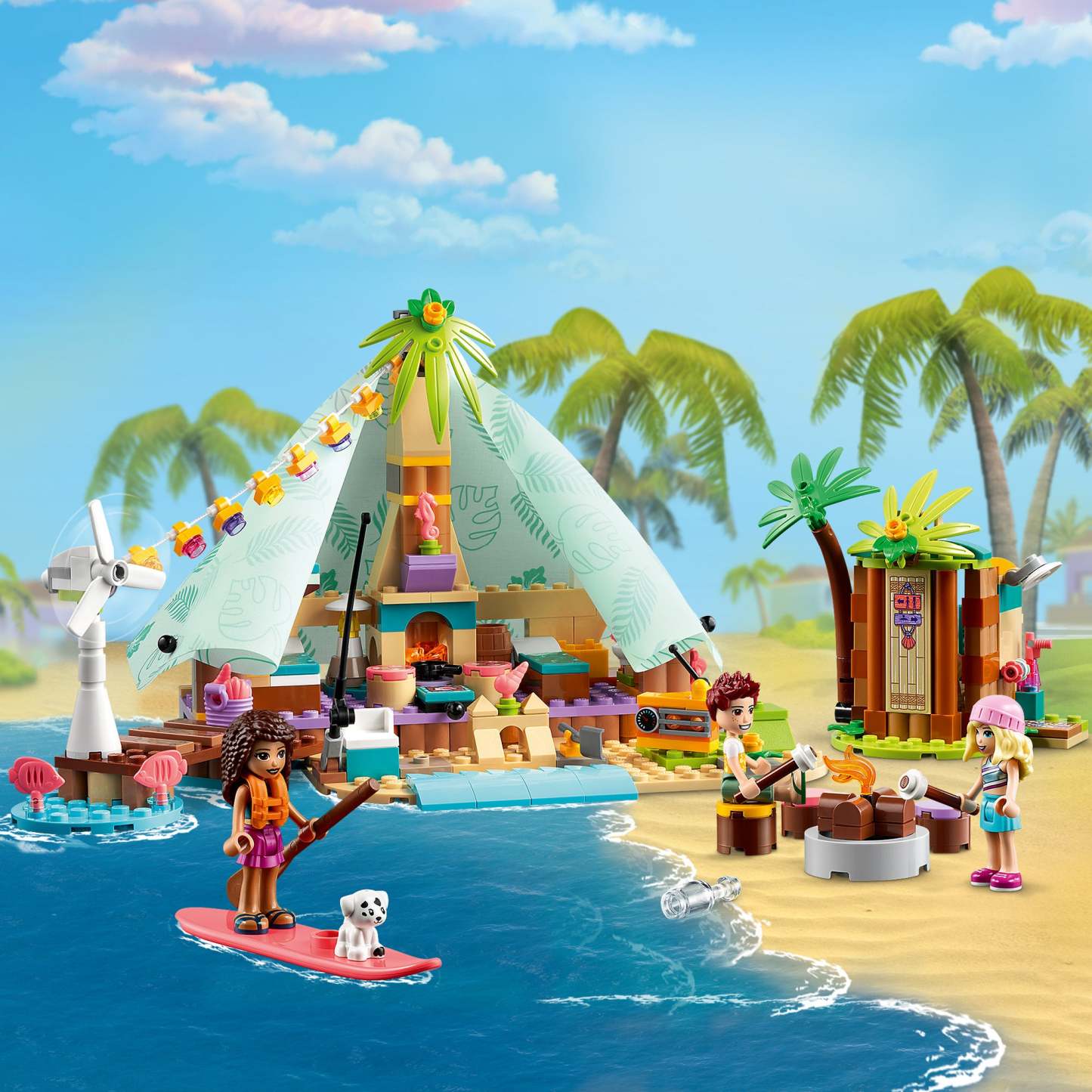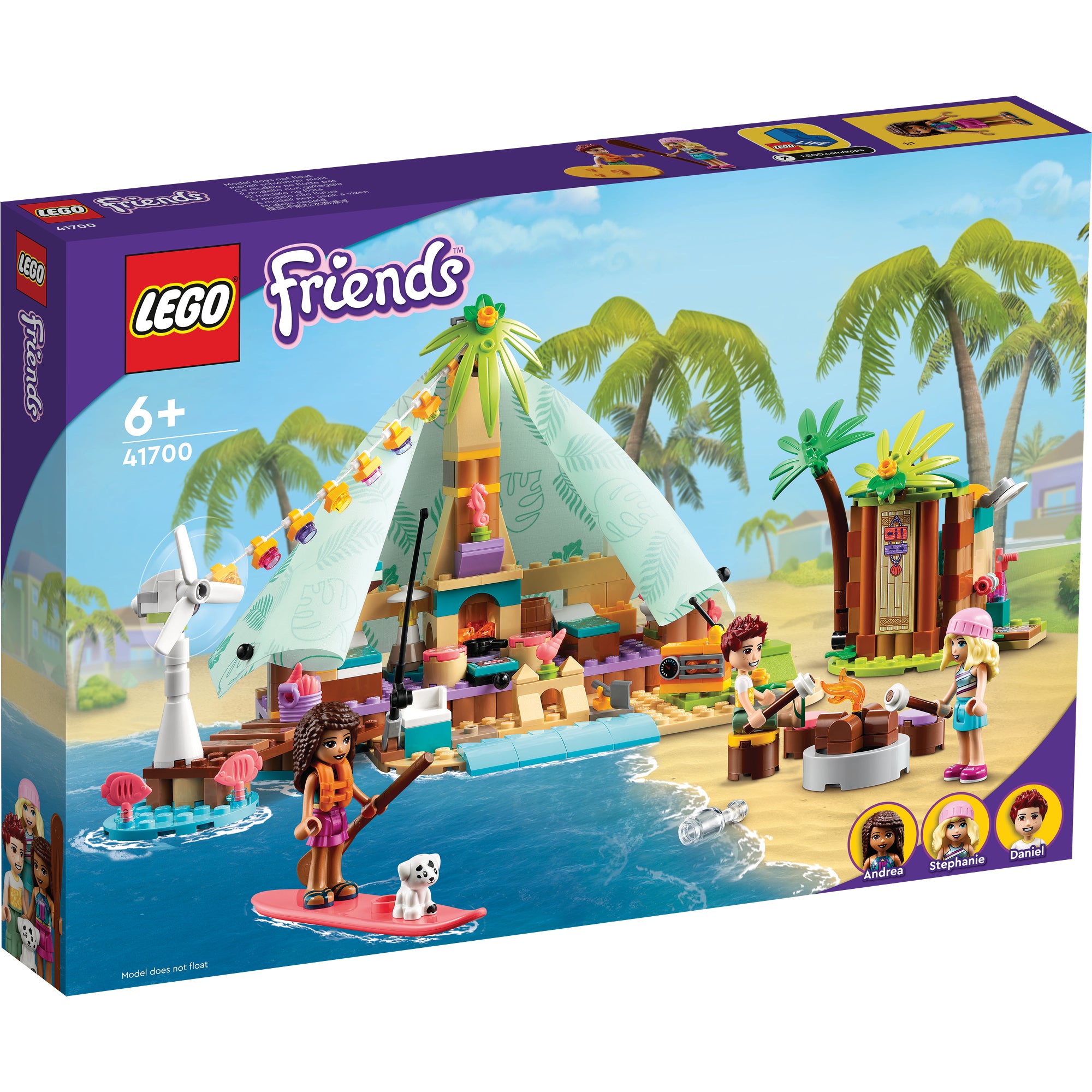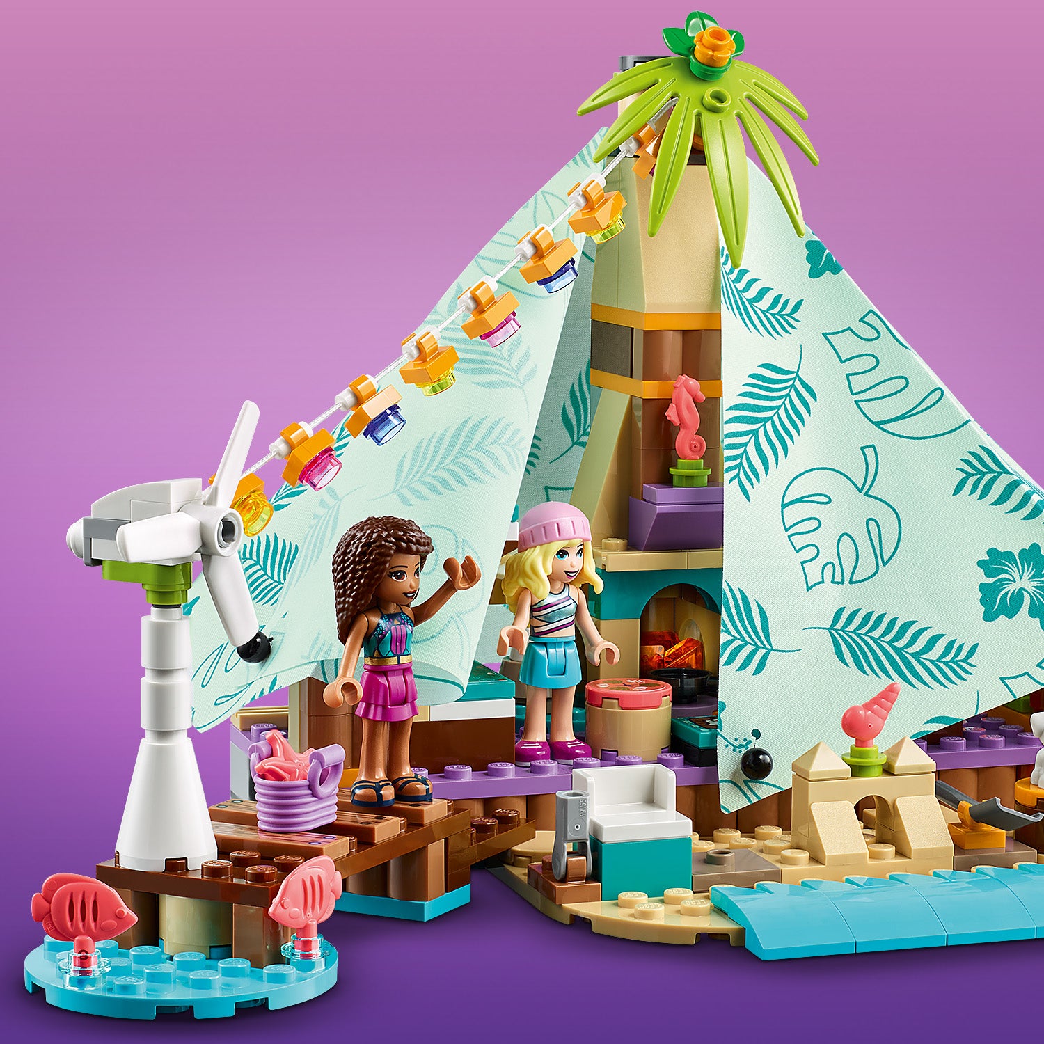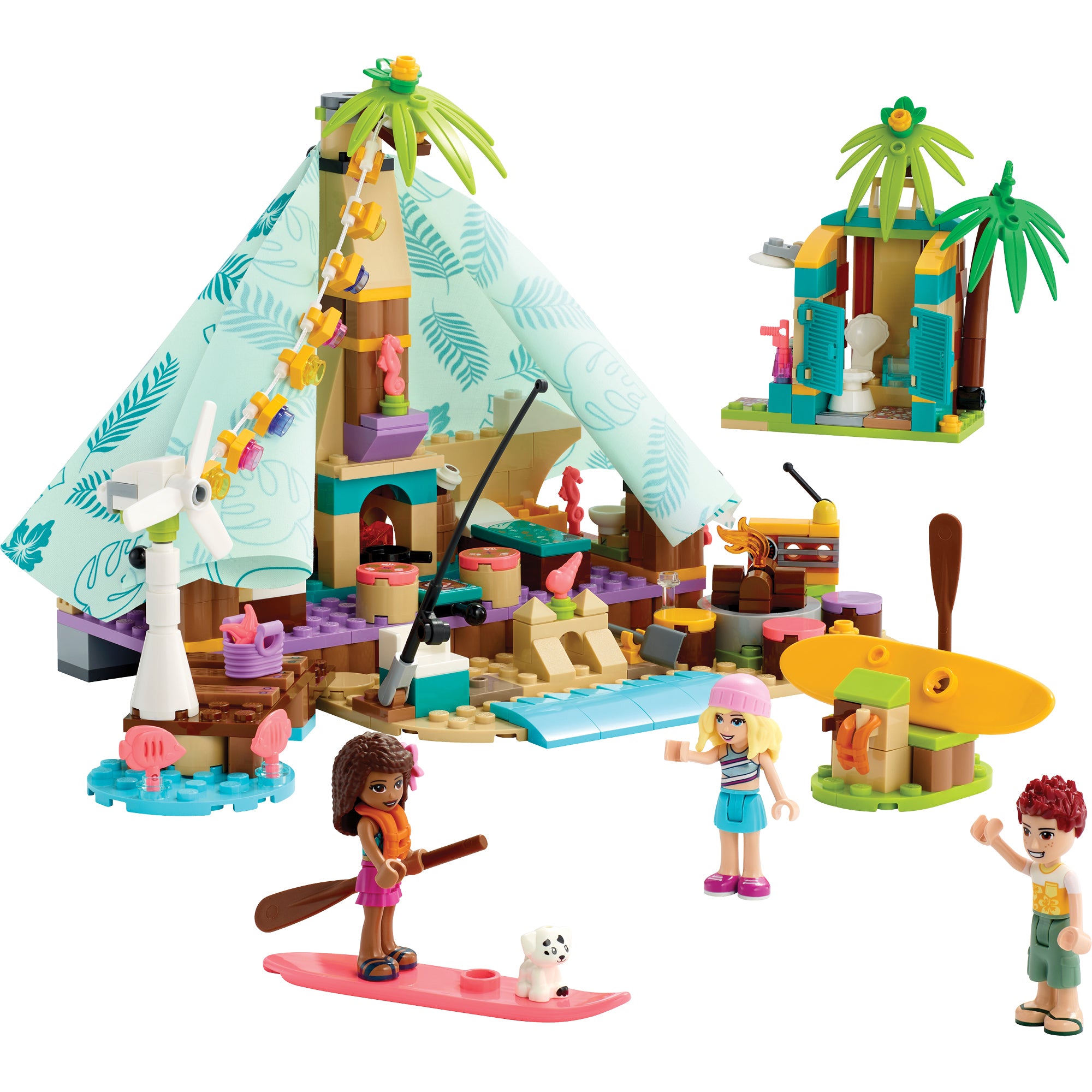 - Camp in style – LEGO® Friends Beach Glamping (41700) includes 3 mini-doll characters, a puppy figure, tent with bunk beds, stove and fabric cover, plus a spinning wind turbine to power the lights