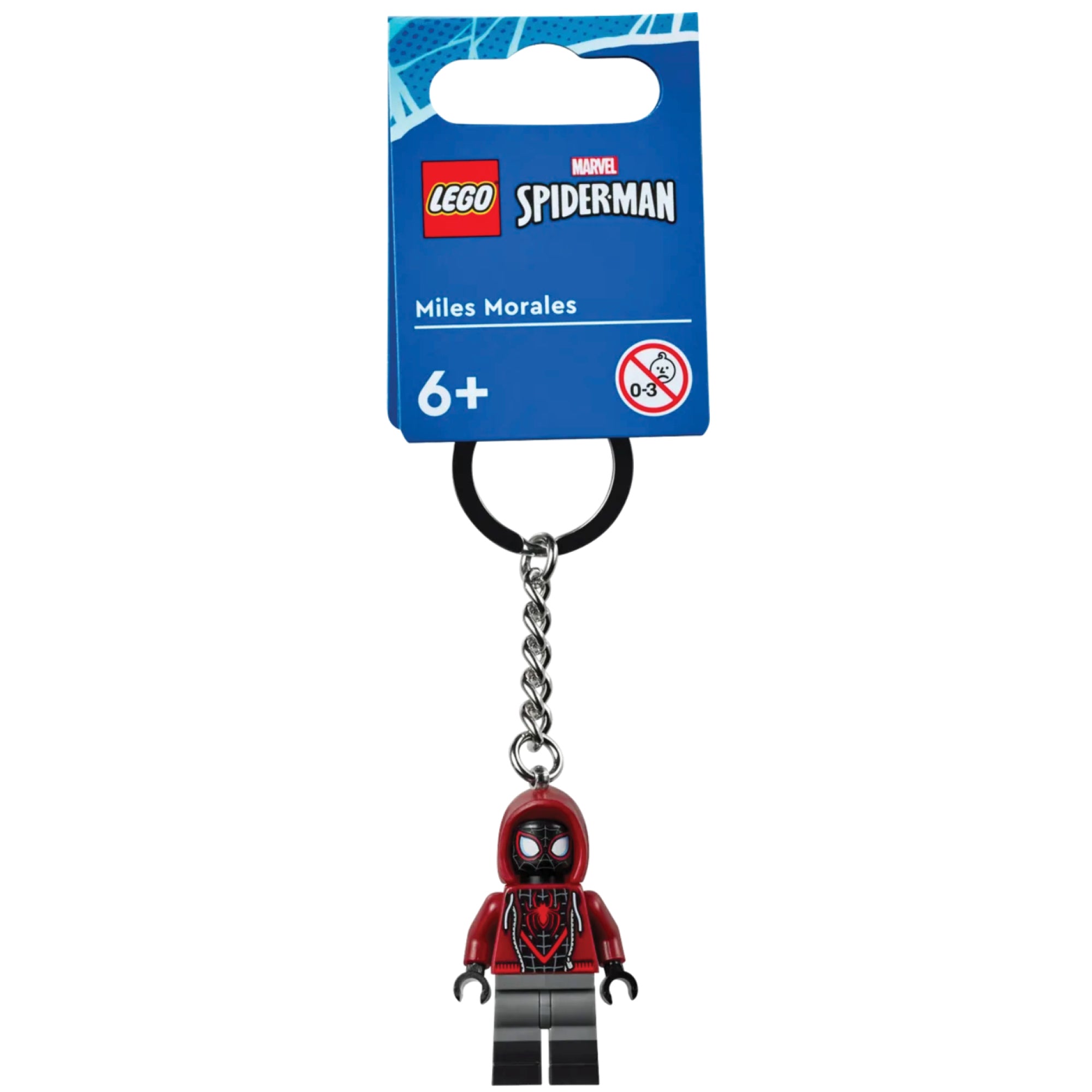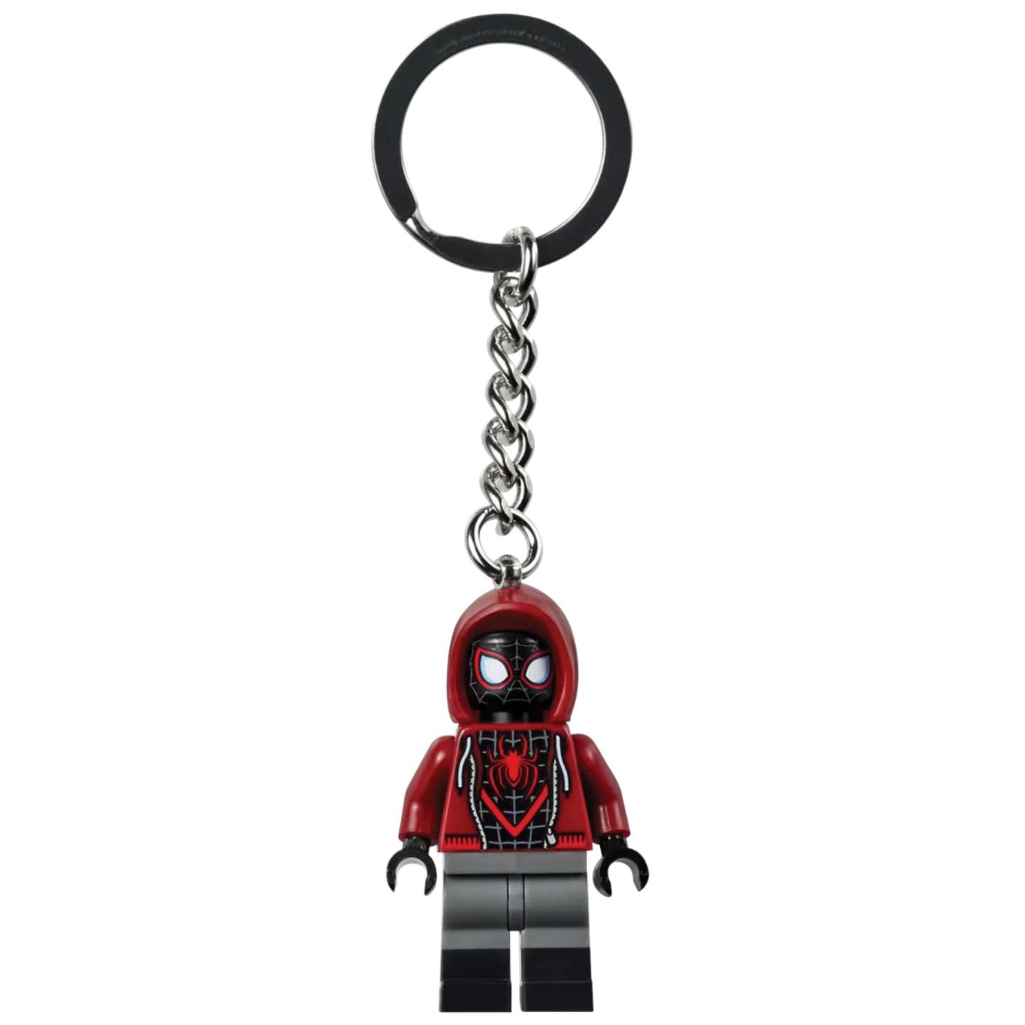 - LEGO® minifigure keyring – A Miles Morales minifigure with posable head, arms and hands is attached to a durable metal chain and key ring. The minifigure is not detachable from the chain