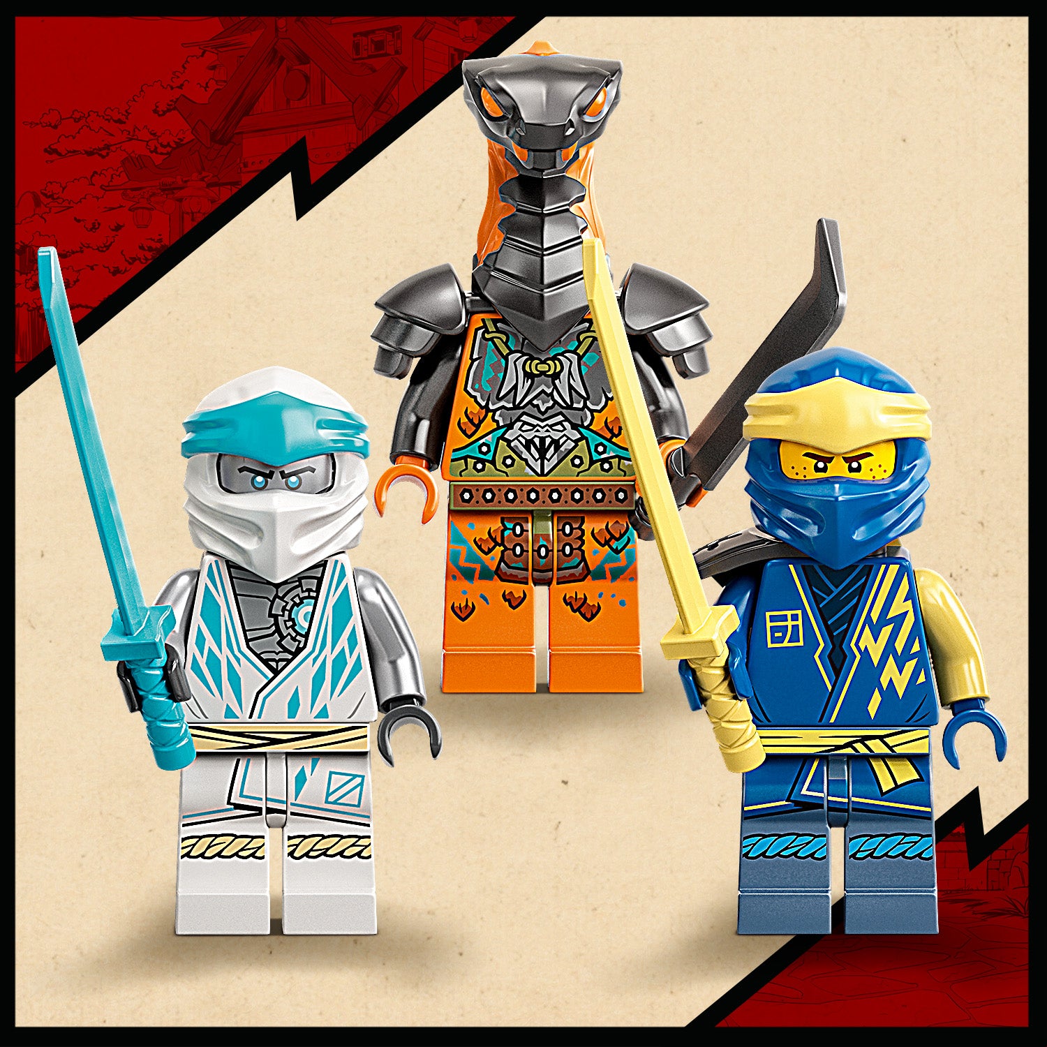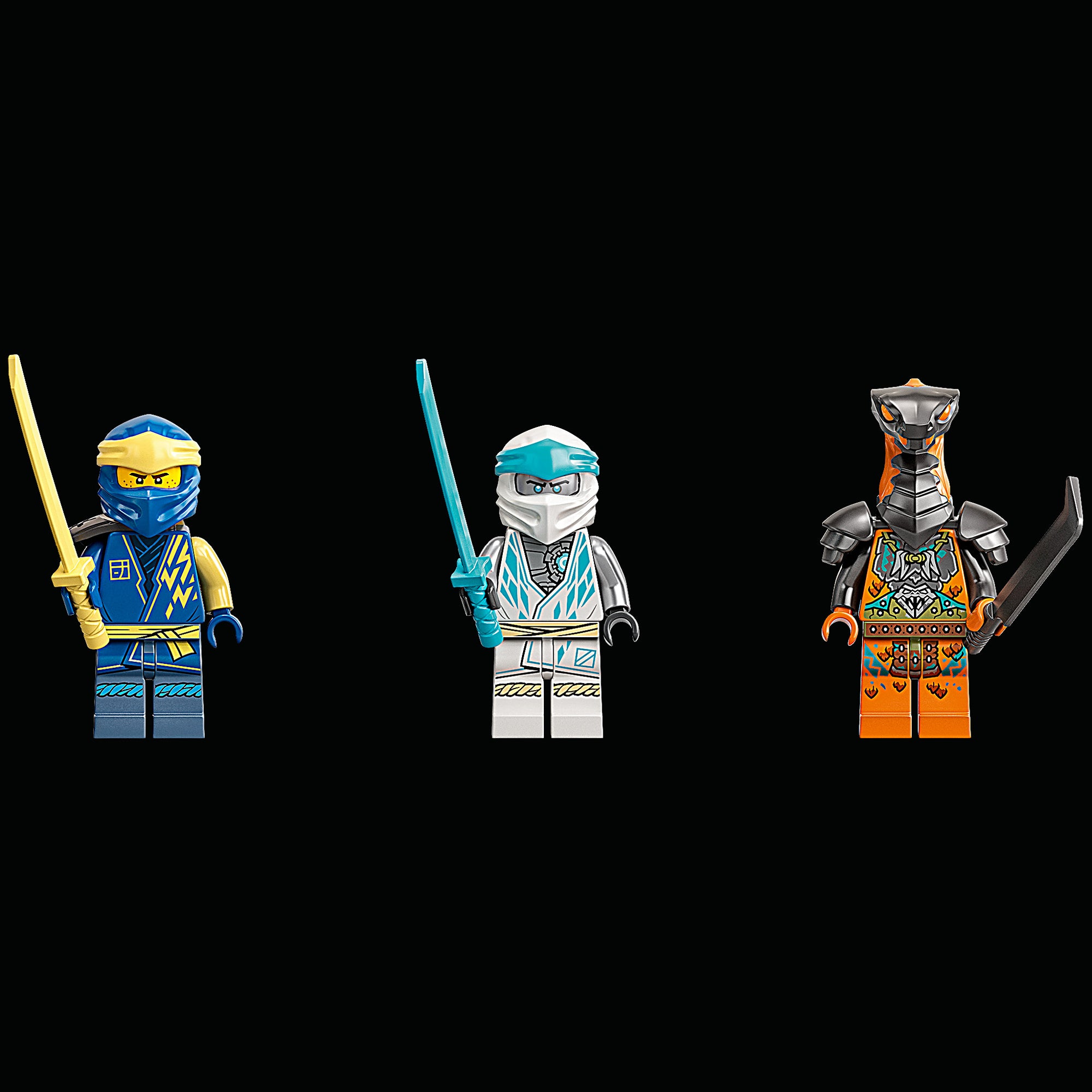 This Buildable kit includes 3 minifigures: Jay armed with a sword, Zane with a spinner and sword, and Boa Destructor with a sword, to play out death-defying battles. New for January2022, when kids defeat the ninja enemies and complete their training and mission, they are rewarded with a collectible banner.