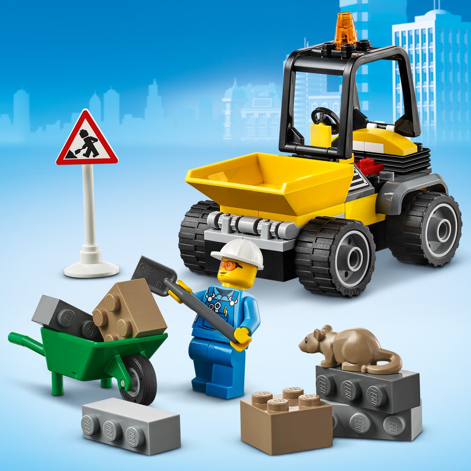 - This LEGO® City Roadwork Truck (60284) playset includes a front-end loader, wheelbarrow, traffic cones, roadworks sign and a shovel, plus a worker minifigure and rat figure.
