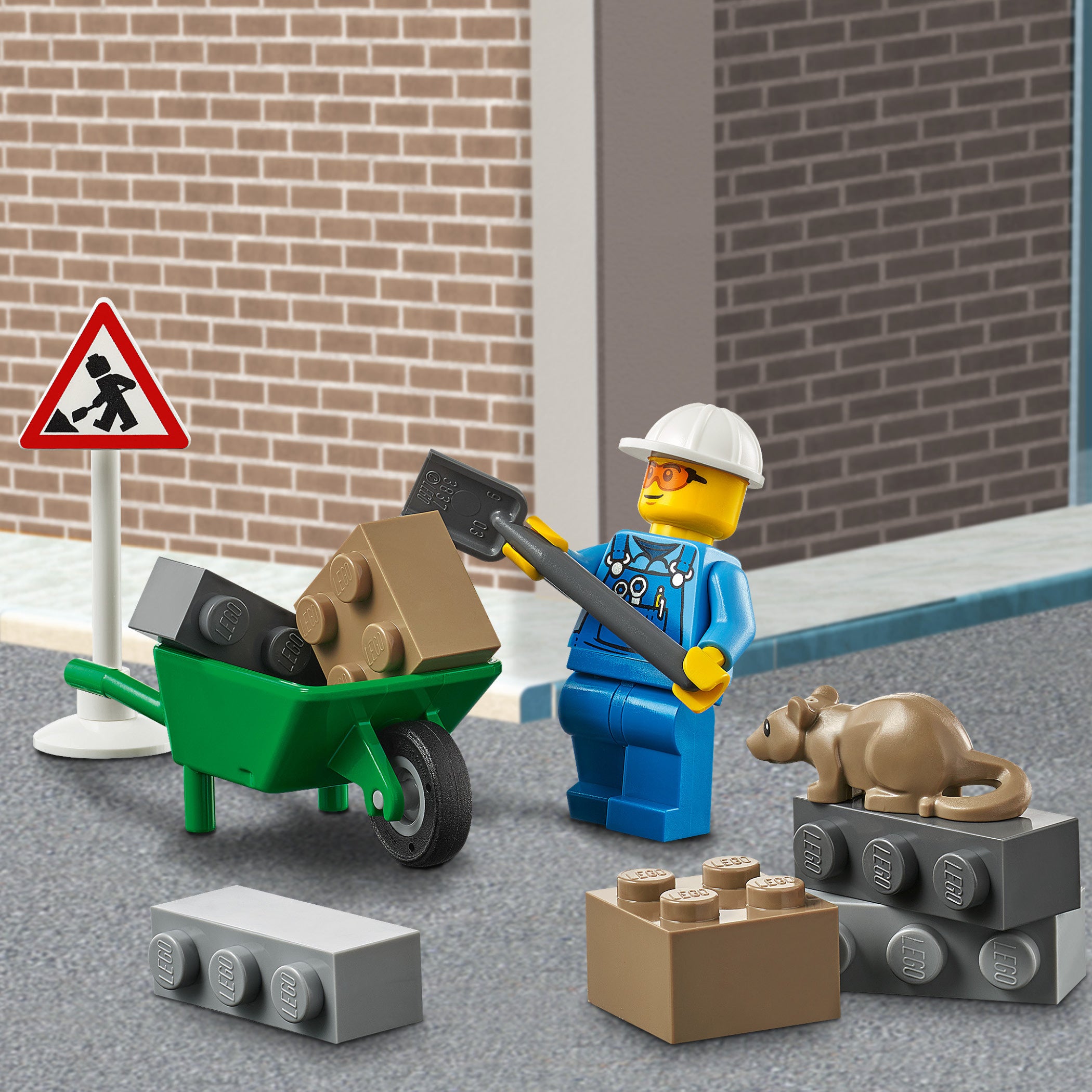 - Kids can cordon off areas with the roadworks sign and traffic cones, fill and tip the front-end loaders bucket and play out fun scenarios featuring the road worker minifigure and rat figure.