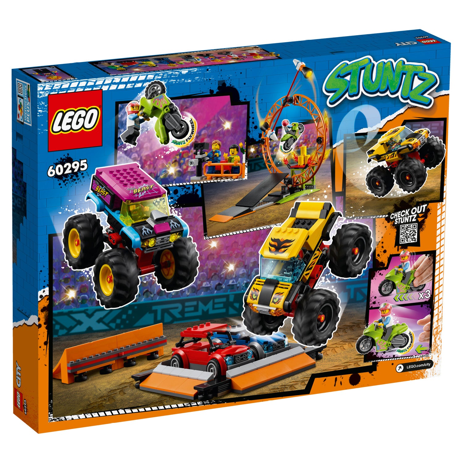 - Kids stage awesome displays and competitions featuring a flywheel-powered stunt bike and 2 car-crushing monster trucks. Combine this set with others from the LEGO® City Stuntz range for even more fun!