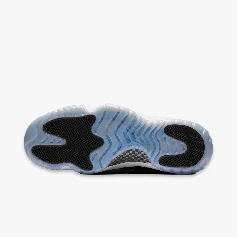 The instantly recognizable patent leather rand found on the Air Jordans 11 gets updated for this 'Emerald' colorway with a shiny iridescent finish. The Air Jordans 11 Retro Low 'Emerald' swaps out the ballistic mesh traditionally found on its high-top counterpart for a premium all-leather build. Featuring a white upper with a matching lace loops. an icy rubber outsole completes the look.