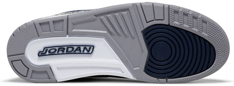 The 3 Retro ��Georgetown is clad in the signature colors of the Hoyas . the team that Michael victimized on the way to an NCAA national championship. The classic silhouette features a navy tumbled leather upper . reind with signature elephant print overlays at the toe and heel. Jumpman branding hits adorn the grey synthetic leather tongue and molded navy heel panel. Lightweight cushioning is provided by a polyurethane midsole enhanced with a visible unit under the heel.