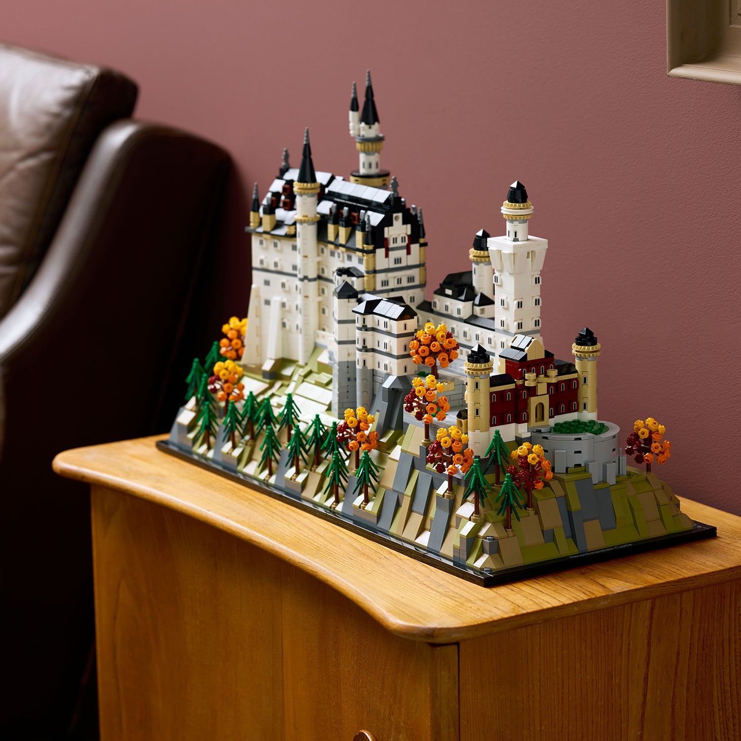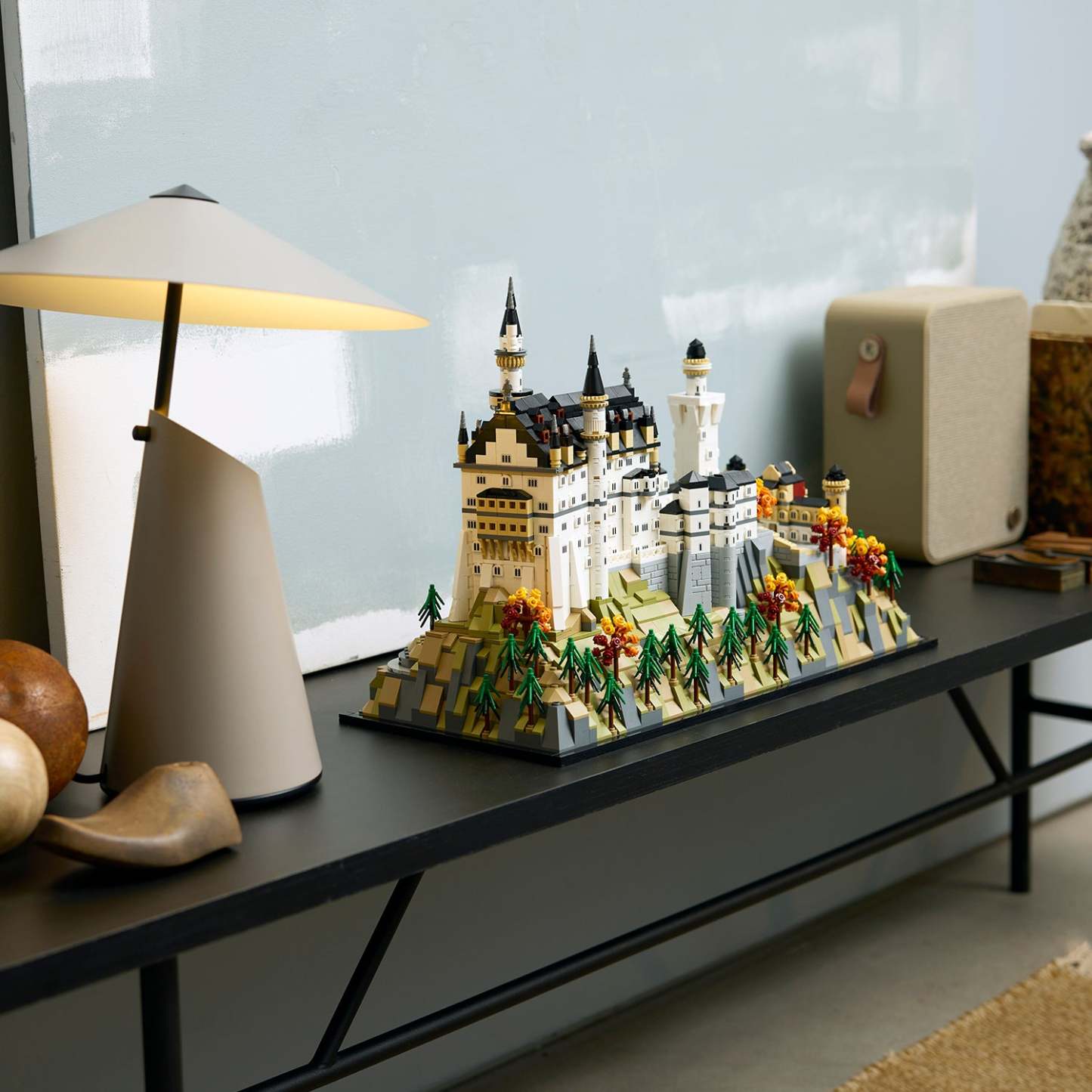 Dive into your passion for iconic landmarks with this collectible 3,455-piece LEGO® Architecture Neuschwanstein Castle (21063) building set for adults. Spend quality time building a display piece that also makes a great architectural gift for you or other history lovers. The build is full of surprises, from the exterior spires, turrets, courtyard, staircases and gabled roofs to the small interior builds. Plus, the foliage of the surrounding trees can be changed to depict a summer or autumn landscape. Serenity awaits as you build this detailed LEGO castle set.