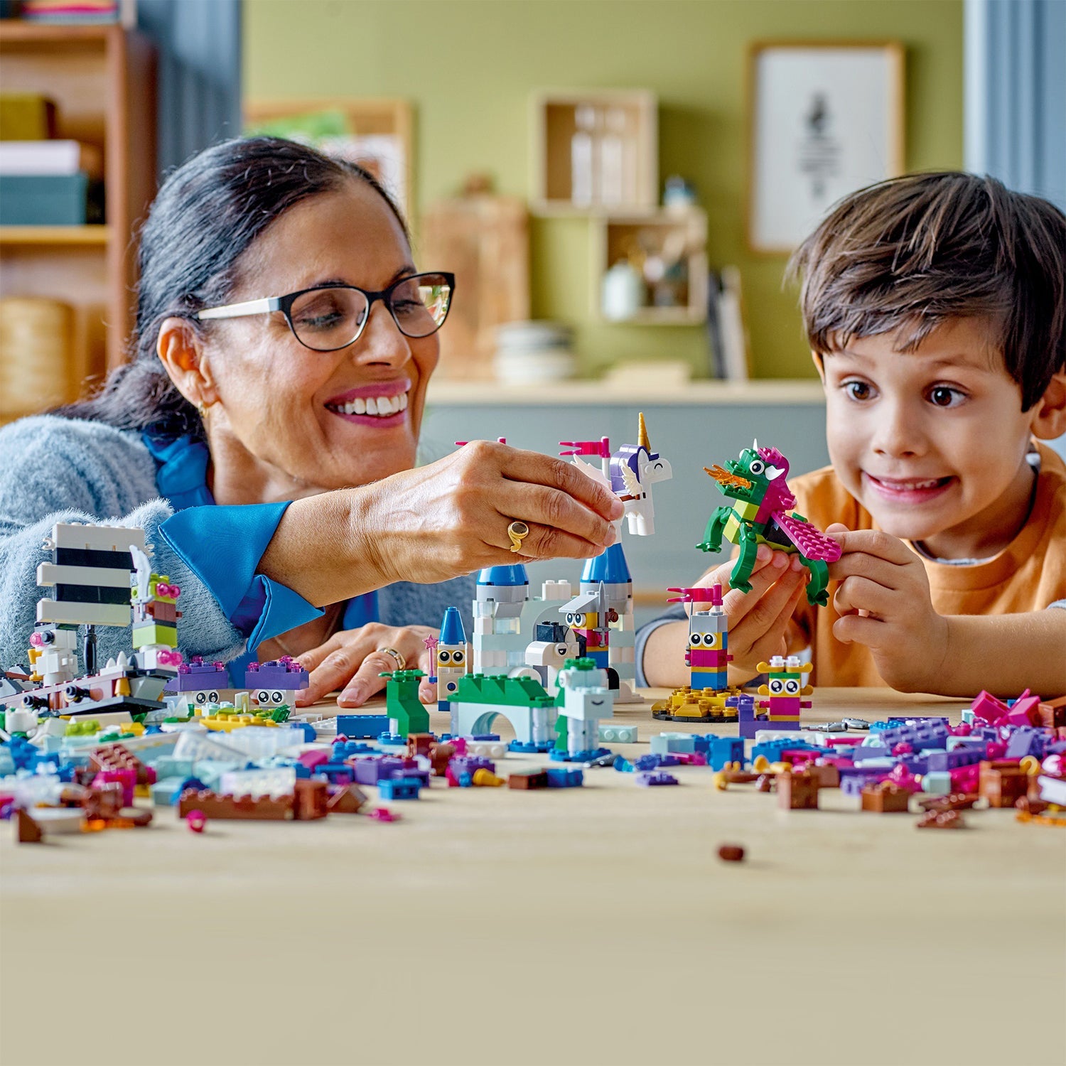 - A rainbow of colors – The set contains 1,800 brightly colored bricks, including gold, silver and opalescent elements, to build a dragon, castle, pirate ship, knights and many more inspiring toys