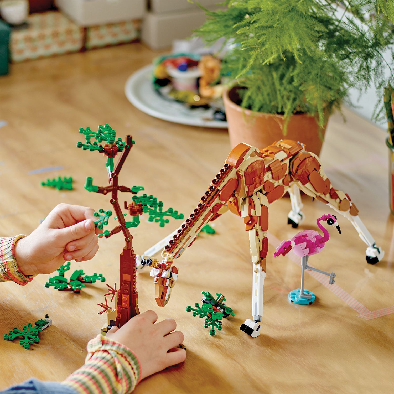 This LEGO set offers kids a world of play possibilities with 3 different animal toys to build using the same bricks. They can build a posable giraffe toy with a tree and a flamingo, rebuild it into 2 posable gazelle toys, a mother with her calf, plus 2 bushes, or turn it into a lion toy with a tree and a butterfly.