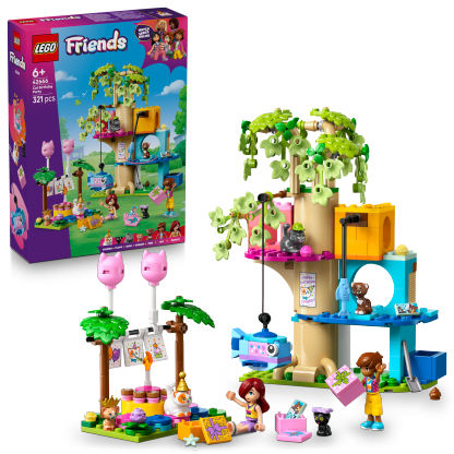 Discover a paw-some building kit for girls, boys and cat-lovers aged 6 and up. The LEGO® Friends Cat Birthday Party & Tree House (42666) toy comes with 2 minidolls, 5 cat figures and lots of accessories for imaginative play packed with sweet kitty moments.