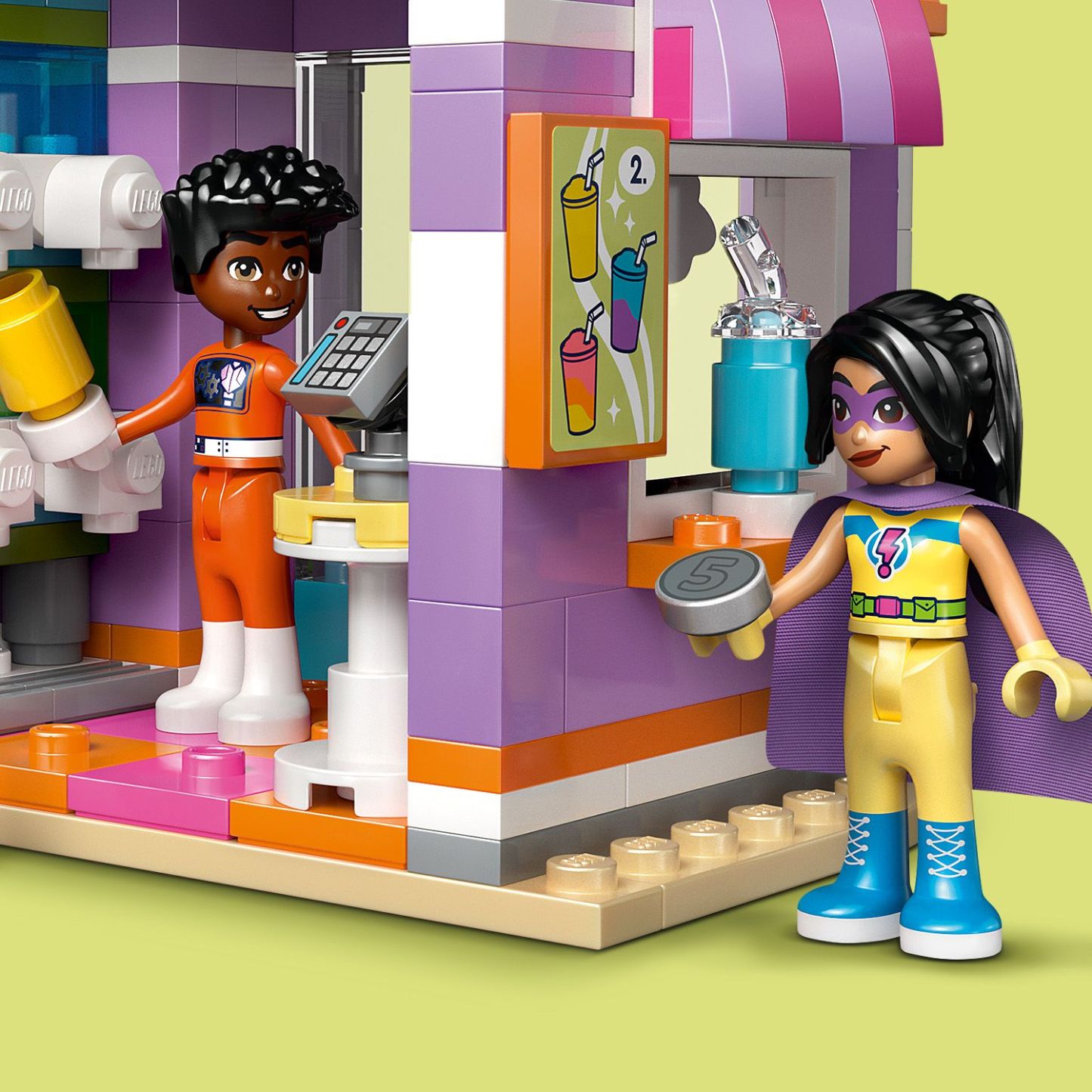 Kids can act out lots of adventures for friends Zac, Nova, Liann and Aliya, who are wearing their fun robot, superhero, galactic explorer and knight costumes. Discover the store’s plushies and the toy vending machine, which dispenses cute little LEGO tiles. Upstairs there’s space where the characters can play computer games before grabbing a treat from the slush ice store next door.