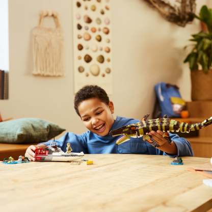 - Mosasaurus toy dinosaur set – Thrill Jurassic World Rebirth movie fans aged 9 and up with this Brick-Built Mosasaurus Boat Mission building kit, combining dinosaurs and action play