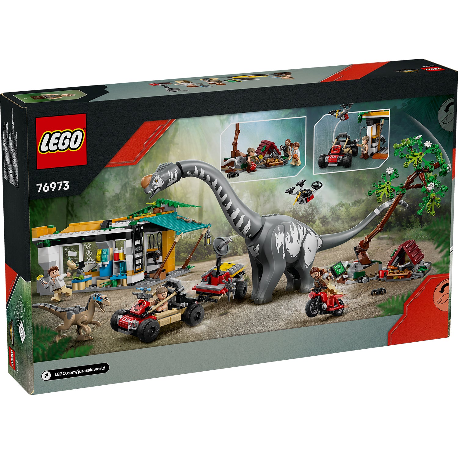 - Creative functions – The set includes a falling tree, a drone that attaches to the toy vehicle or the station roof, a Velociraptor with opening jaw and Titanosaurus with movable head, neck and tail