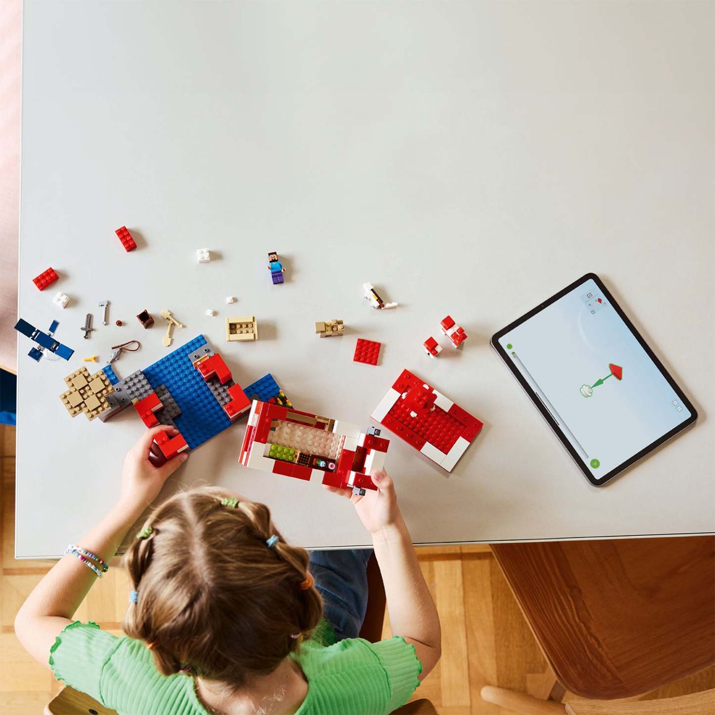 - Hands-on video game toy – Kids build a large, mooshroom-shaped house with a small farm on an island, go fishing in a boat and search for treasure