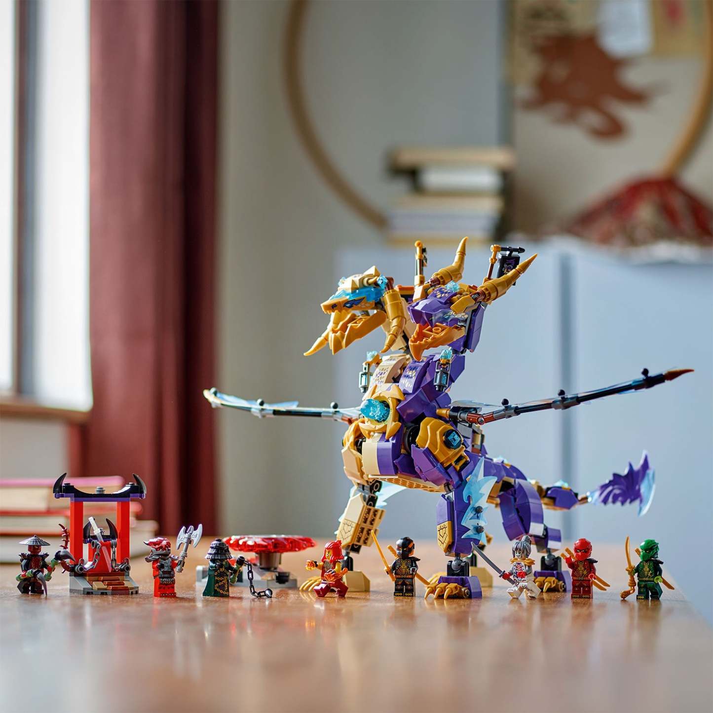 - Interactive NINJAGO® dragon – Kids can activate a shooter in the dragon’s chest and move its large foil wings back and forth using a lever on its back