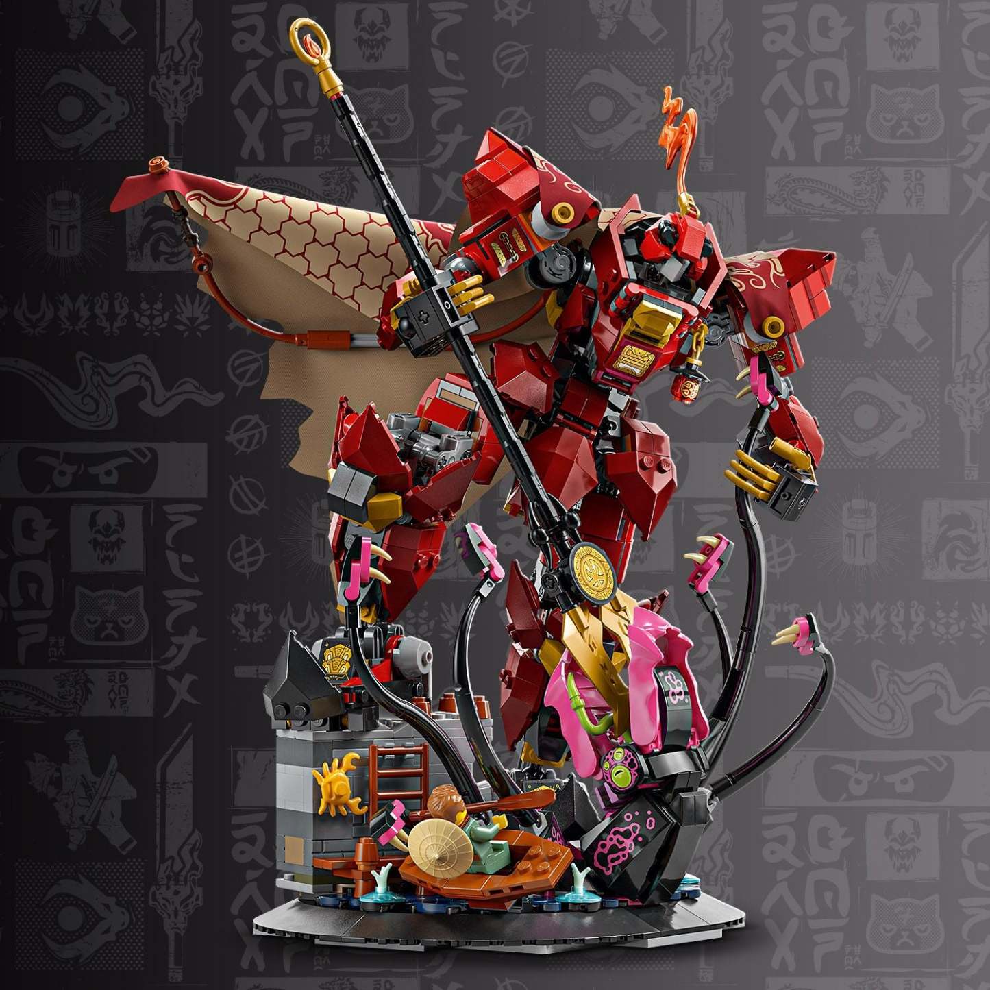- Interactive model – Ninja fans can remove the model from its base to stage stories from the NINJAGO® Legends Monstrosity series between the posable mech and a monster with movable tentacles