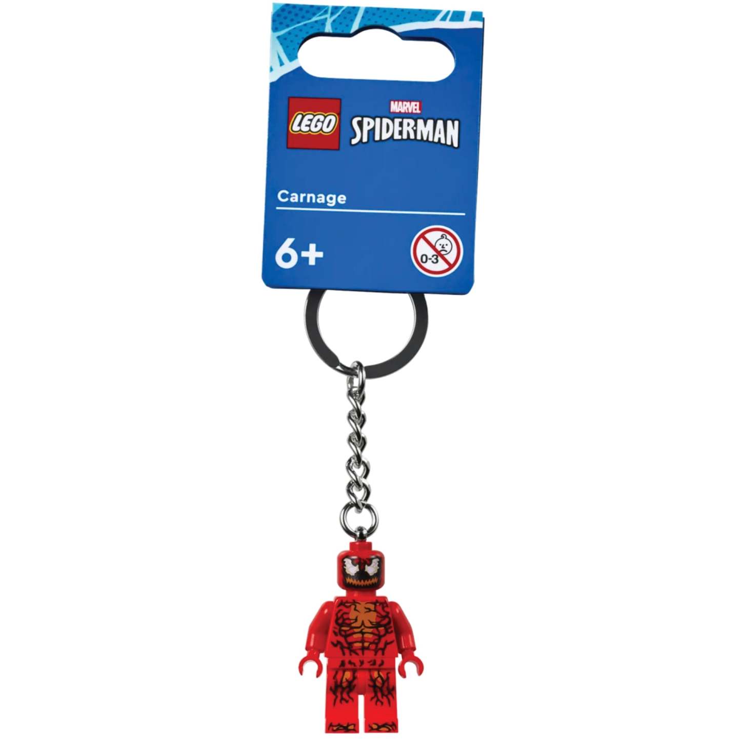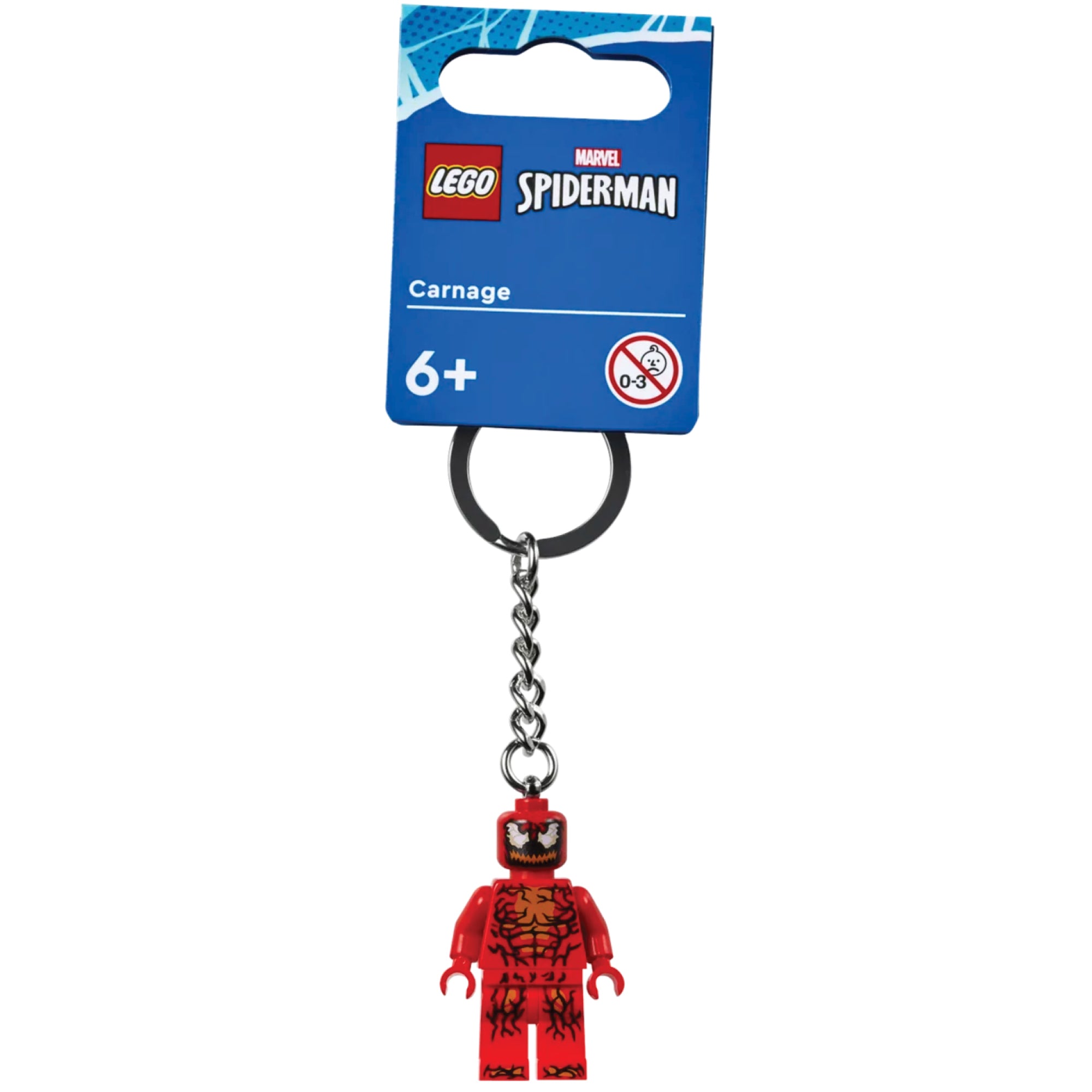 - LEGO® minifigure keyring – A Carnage minifigure with posable head, arms and hands is attached to a durable metal chain and key ring. The minifigure is not detachable from the chain