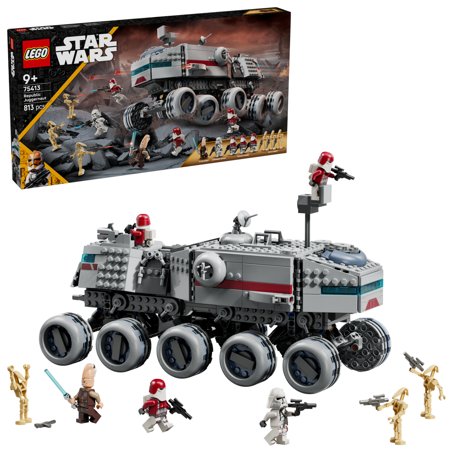 Let kids lead their own heroic Star Wars: The Clone Wars™ battle missions with the Republic Juggernaut buildable transport vehicle toy (75413). A cool LEGO® Star Wars™ gift for boys, girls and fans aged 9 and over, this impressive 10-wheeler is steered by simply tilting the model as you move it, and it has easy access to the detailed interior.